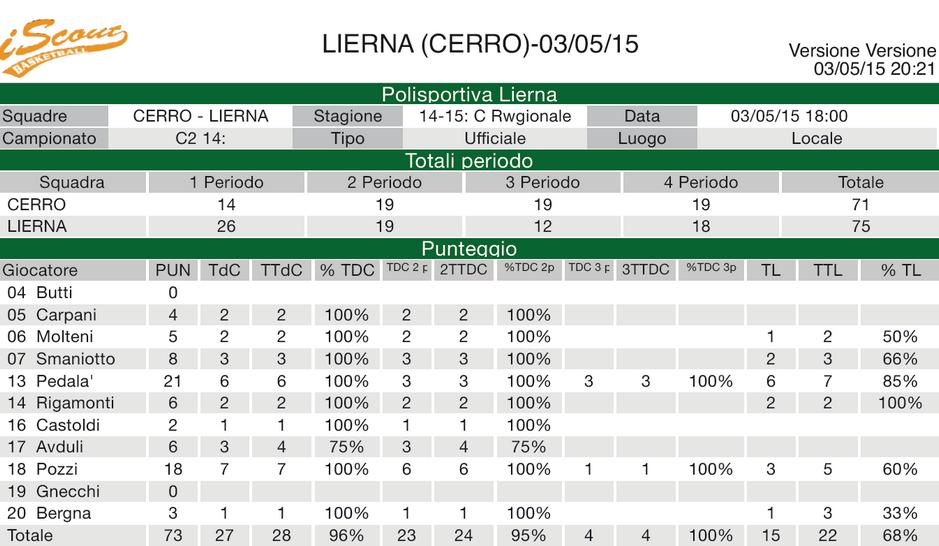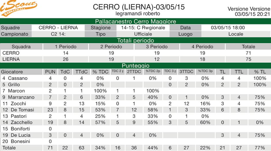 Pall. Cerro Maggiore -- Pol. Lierna 71 -- 75 Parziali 14-26, 33-45, 52-57