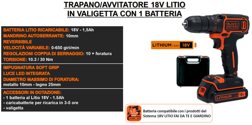 Un trapano/avvitatore ad alte prestazioni è componente essenziale di ogni cassetta degli attrezzi. Un trapano/avvitatore con batteria 18V al Litio di BLACK+DECKER ti fornisce tutta la velocità, la torsione e l’autonomia di cui hai bisogno per forare su legno, metallo e materiali plastici. Le 10 regolazioni della coppia di serraggio ti consentono di avvitare con accuratezza, mentre il design compatto ed il peso ridotto garantiscono il massimo comfort in uso e la possibilità di lavorare anche nelle aree più ristrette e di difficile accesso. Prodotto parte del sistema 18V Litio, la stessa batteria può essere utilizzata con eletttroutensili per il giardino BLACK+DECKER a batteria 18V!